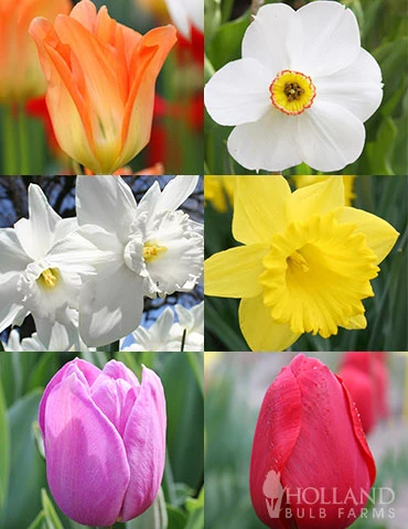 Daffodils and tulips are the most popular spring flowering bulbs. To extend your bloom season plant varieties that bloom early, mid and late spring. This collection takes the guess work out of attaining a long bloom season, as we have selected 3 popular daffodil varieties and 3 popular tulip varieties that have different bloom seasons.