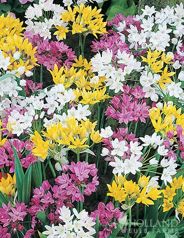 The parade of blooms starts very early with Glory of the Snow blooming with blue blooms early in the season. After that the delightful Mixed Crocus will flower. The parade continues with Mixed Sorbet Tulips and Mixed Ground Cover Tulips. The finale of the parade is the Mixed Small Allium.