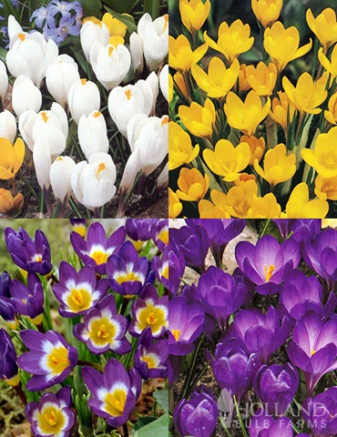 Crocus are a classic spring flowering bulb! After a long winter of snow and cold it is hard to beat seeing the crocus burst through the snow! This classic combination of 4 favorite crocus features purple crocus, yellow crocus, white crocus and a tri-color crocus combining all 3 colors!