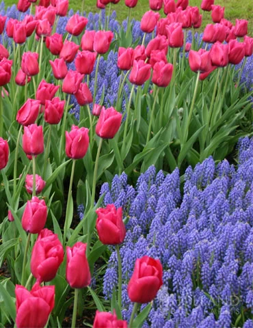 This duo won’t break your heart or the bank! Charming pink Don Quichotte Triumph Tulips are surrounded by a sea of blue grape hyacinths, will make for a heart melting combination! This duo covers 1 square foot.