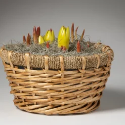 This basket of blooms includes 3 Full House Daffodils, 5 Tete a Tete Daffodils, 2 Blue Star Hyacinths and 6 Harmony Dutch Iris. Potted bulb garden garden comes complete with a 8″ woven pot with plastic lining, soil, & bulbs, for immediate growing.