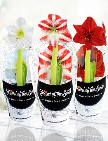 This delightful trio of 3 festive amaryllis is ready to grow! Three pre-potted amaryllis are included in the collection, all you or your gift recipient needs to do is add water.