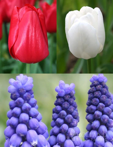 Show your patriotism with flowers this coming spring! The Red, White and Blue Collection will adorn your planting beds mid spring, with Red and White Tulips, accented by Blue Grape Hyacinths in the front of them. A classic combination that shows your love for the USA!
