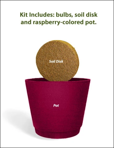 Who can resist the fragrance of paper whites blooming in there home in the winter? Plant amongst your Amaryllis for an indoor holiday delight! This Ziva Paperwhites Gift kit includes 4 bulbs (14/15cm), a soil disc for planting and a raspberry-colored plastic pot. The pot can easily be slipped into a fancier pot that is 6″ diameter or larger. Don’t pass up these lovely easy to grow bulbs!